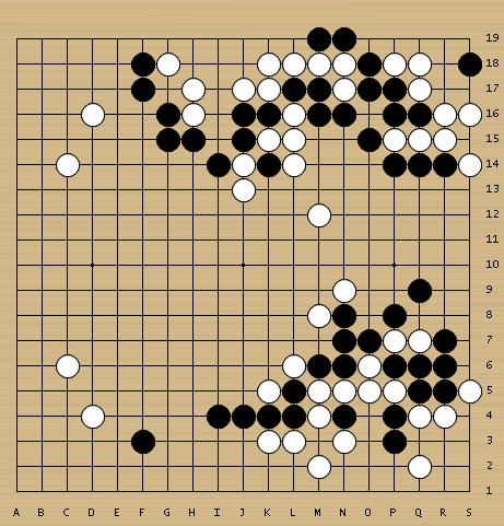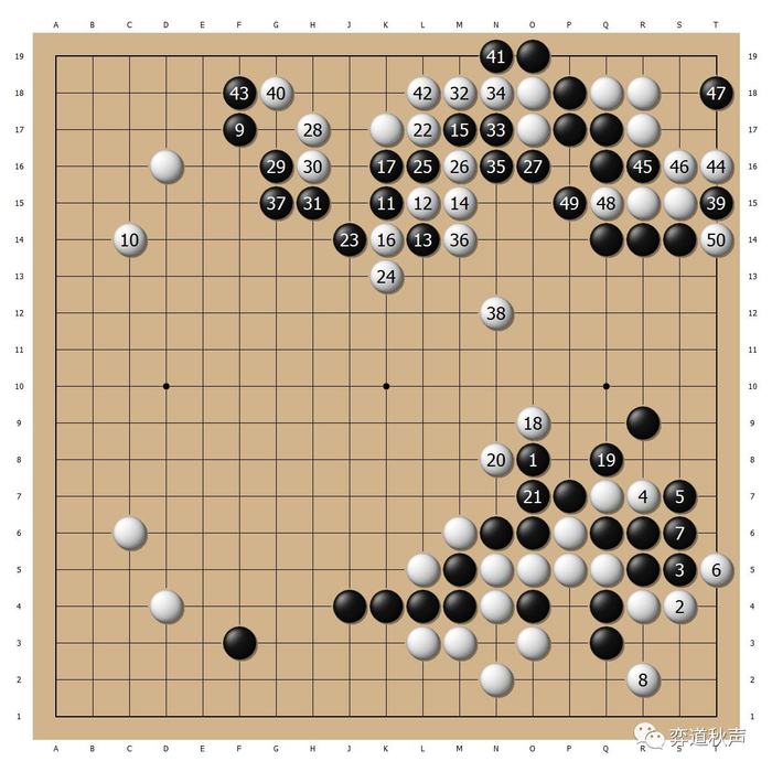 开局平稳,没有AlphaGo流的痕迹。因为是接力赛,思路一致很重要,城围联赛事大家的开局都比较扎实,不太采用试验性布局。
