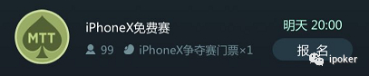 坚豆扑克上线福利,iPhoneX免费送,今晚20:00开赛,现门票免费添加中,参与方式如下。