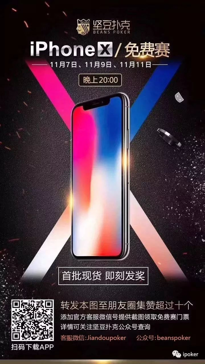 11月11日晚20:00,将在坚豆扑克APP上开启iPhoneX免费赛,每场比赛奖励iPhoneX 1台(首批现货!顶配256G!)。