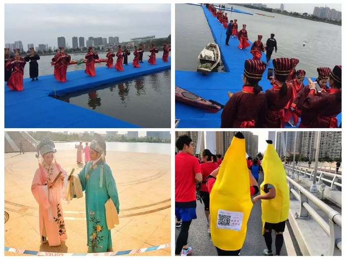 组委会更在沿途的迪荡湖、官渡河、瓜渚湖安排了摩托艇、水上皮划艇、乌篷船秀表演,还有赛前脱单跑设置,让单身汪在节日里一点都不寂寞。