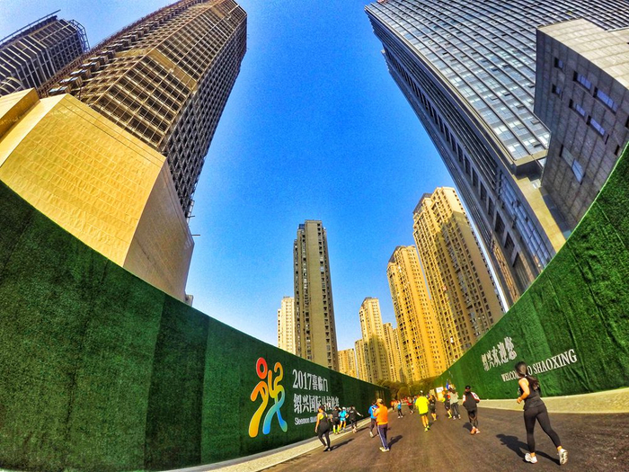 跑出隧道,就来到绍兴城市的CBD中心,眼前出现浙江实际运营的第一高楼天际中心,吸引了很多外国跑者在这里驻足留影。