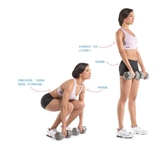 下背不要拱曲,握住哑铃起身。