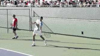 费德勒做了一个教科书般的小臂内旋。他习惯直臂击球,在球拍距离身体最远处,才开始收臂。这一点是值得我们借鉴的。
