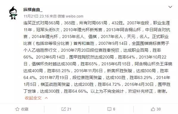 纵横自由微博截图然而令人遗憾的是,目前中国棋院官方网战数据仅仅有等级分以及升段责任局记录,对于棋手职业生涯的数据统计完全缺失。于是,对于这位数据达人的统计是否正确也就无从考证。