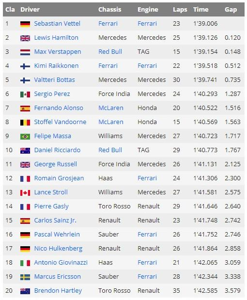 梅赛德斯车手瓦尔特利-博塔斯圈速排名第5,落后维泰尔0.735秒。第6名是印度力量车手塞尔吉奥-佩雷兹,与维泰尔的差距为1.287秒。