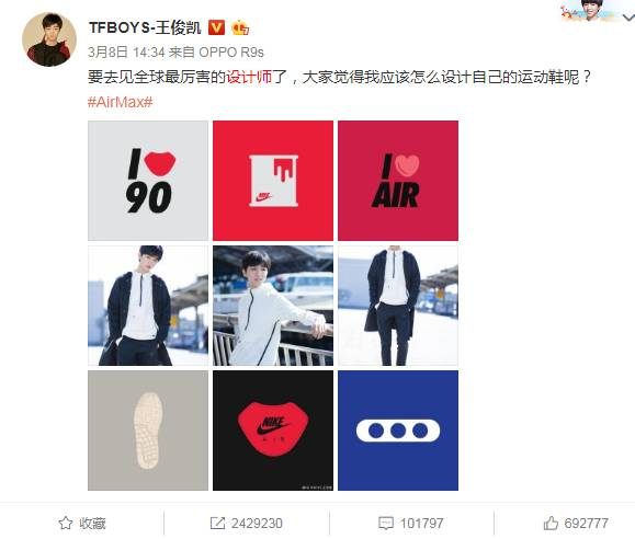早在今年3月,王俊凯就携手耐克做了一次营销活动。王俊凯在微博发布“要去见全球最厉害的设计师了,大家觉得我应该怎么设计自己的运动鞋呢?#AirMax# ”,并配上带有耐克标志的照片,原微博的转发量达到 242 万,而耐克官方微博转发后配文“Safe trip小凯! 期待你在这次旅程中有所收获,和我们一起创造Nike Air的新纪元。 #AirMax#”,转发量也突破了217万。在耐克平均数百的转发量中显得非常惊人。