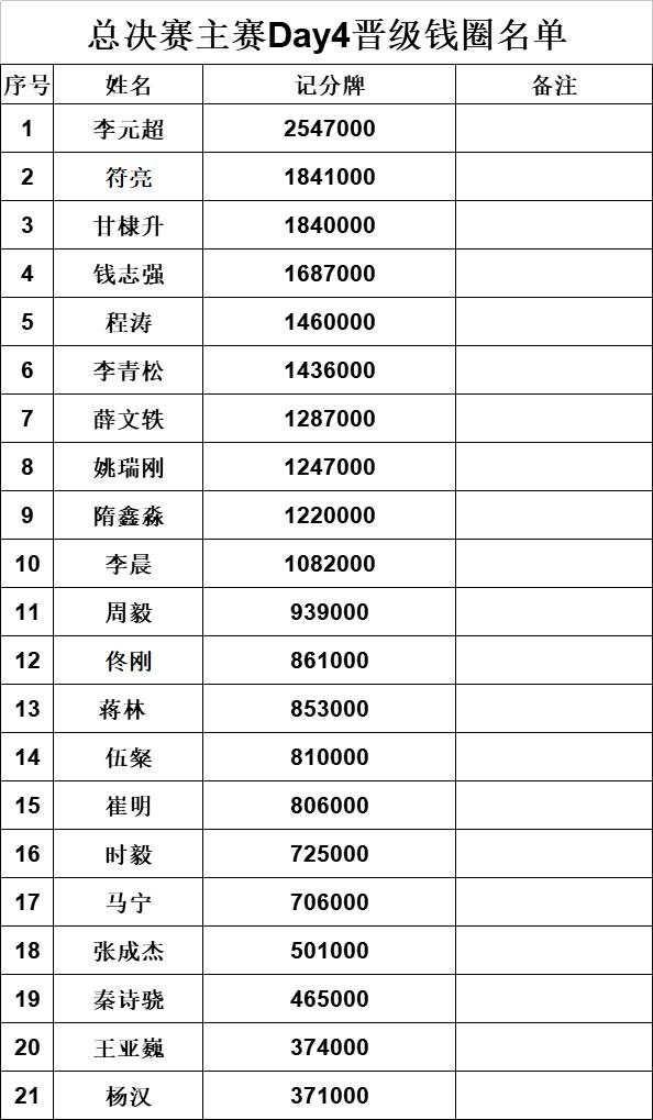 29日下午,DAY4如期而至,经过5个级别的争夺赛,63位选手只有21名成功晋级DAY5,李元超以2547000的记分牌成功领先20位选手成为DAY4的chipleader。精彩的一天即将到来,30日下午13点DAY5即将到来,会不会出现FT名单呢?答案明天揭晓!