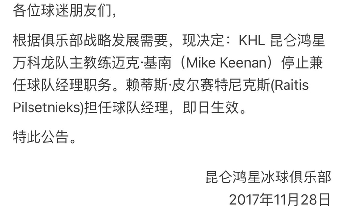 2017年11月28日晚,北京昆仑鸿星万科龙队官方宣布,主教练迈克-基南因俱乐部战略发展需要,停止兼任球队经理职务。