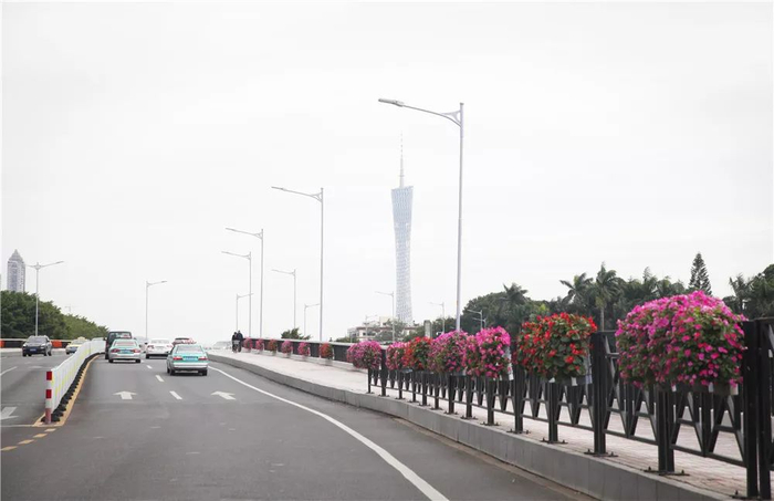 13.5公里左右,选手右转,准备上猎德大桥,这时在路的右边,会看到猎德村牌坊和猎德鼓塔,也是相当有广州特色,此时路段有点起伏,之后是上桥的上坡路段。