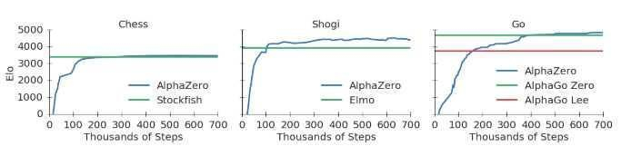 但今天AlphaZero来了(https://arxiv.org/pdf/1712.01815.pdf),它破除了一切怀疑,通过使用与AlphaGo Zero一模一样的方法(同样是MCTS+深度网络,实际还做了一些简化),它从零开始训练: