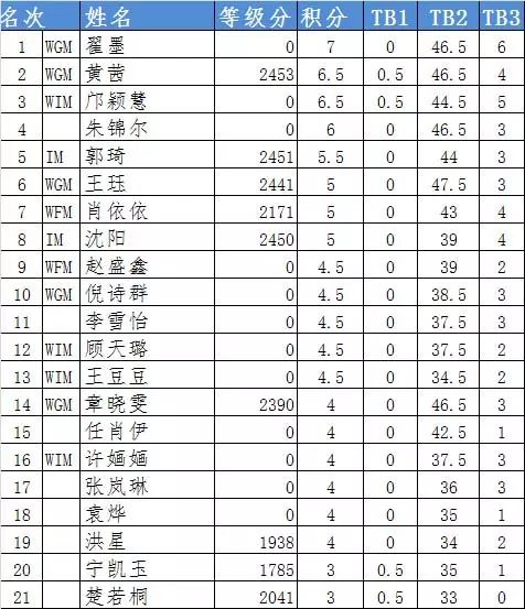 以下是女子快棋赛总积分榜: