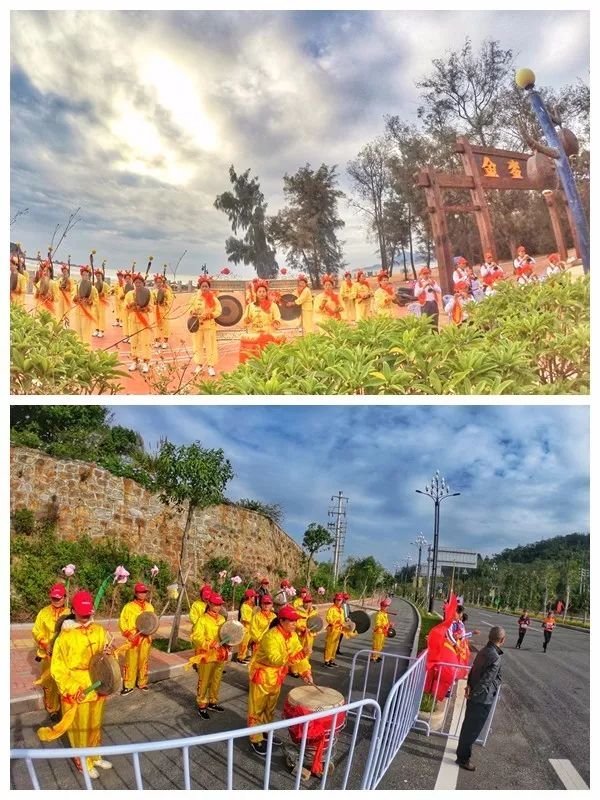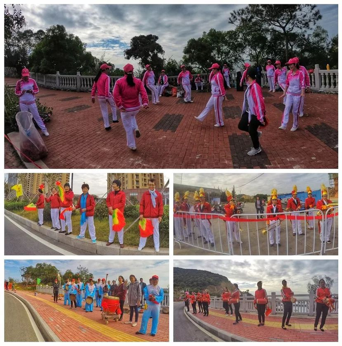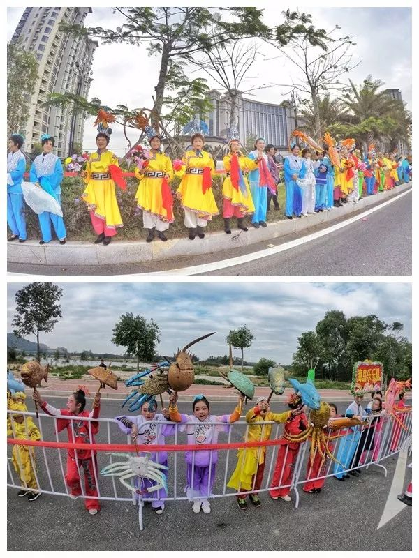 沿路潮州铜锣队、腰鼓队、秧歌队、铜管乐队、扇子队和啦啦队交相辉映,鼓锣声响彻天际。