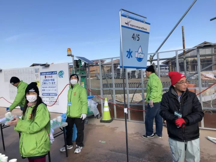 奈良马拉松细节非常到位,我举一个例子你就知道了,所有补给站都有编号。比如桌子前面写着水(1/3),下一张桌子写着水(2/3),有的桌子写着饮料(3/4)……你明白了吧,就是说这个地方有3个水站,这是第一个。明确了信息,如果人多就知道往后走去取水,也不会错过最后一个水站。这点非常值得国内赛事学习。