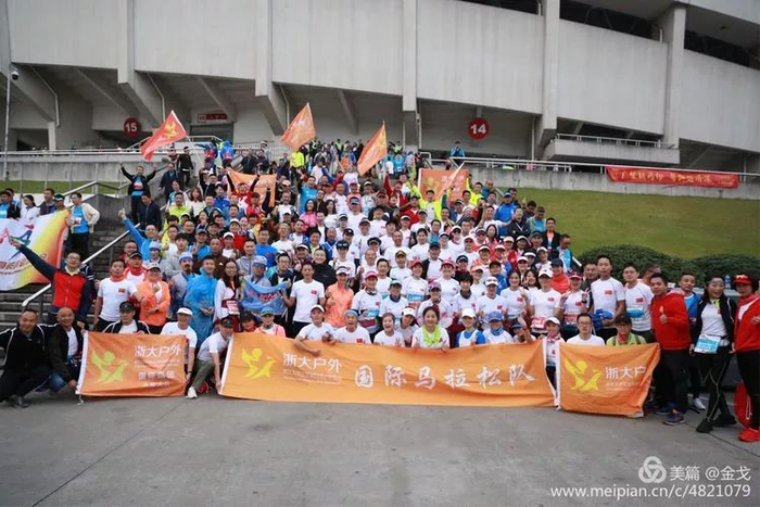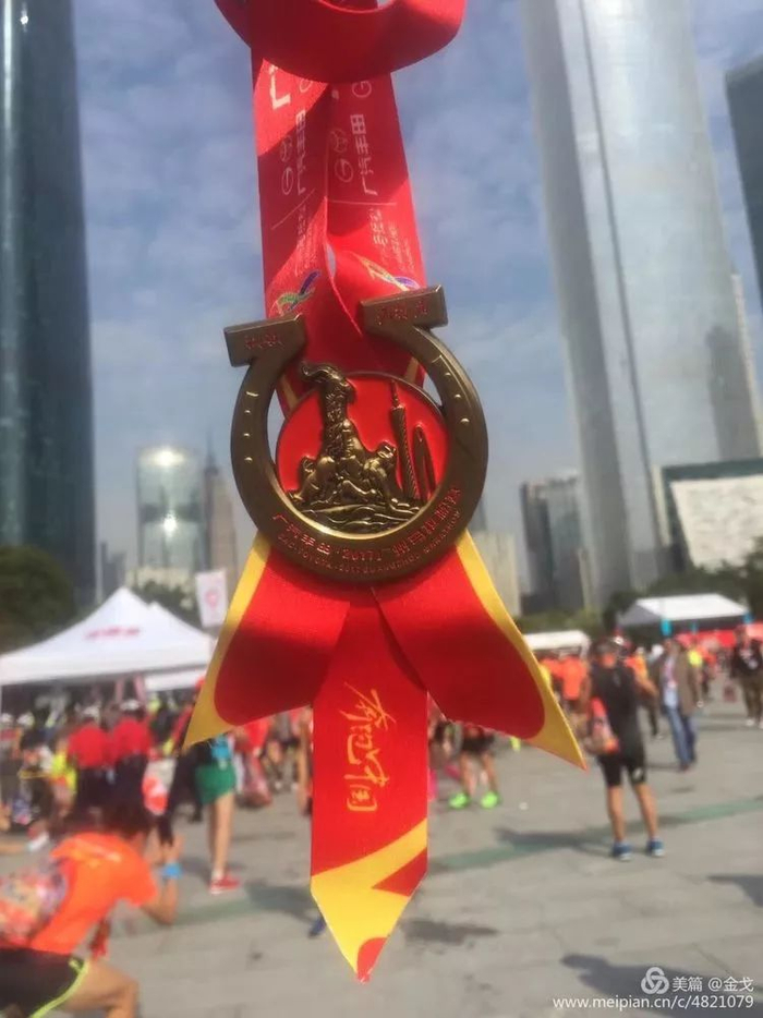 广马赛道的啦啦队加油站真的留给我很深的印象,广州真的是座包容性很强的城市,一年又一年啊,世界大得不可以去拥抱,那么我们就用跑马的脚去丈量吧,这次跑广马的感觉完全不同,一直在控制自己的速度和呼吸,沿途欣赏着各种的美好,觉得这是生命中又一次微妙的体验! 到终点还剩1公里我又掏出了浙大户外悦跑大队的队旗,双手高举着冲过终点,时间定格在354,比无锡快了一分钟,一直受臀中肌拉伤困扰,断断续续,能够跑进4小时我也已经很满意,这一路跑来很多跑友上来和我合影,有的说你这块头在跑马场根本看不见,也的确,别人用生命在跑步我却是用肌肉在跑步了。
