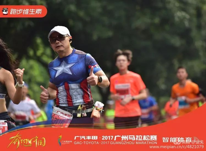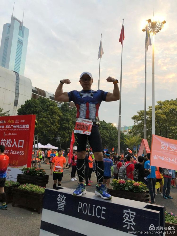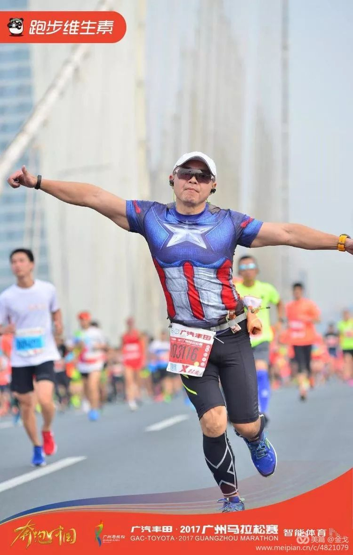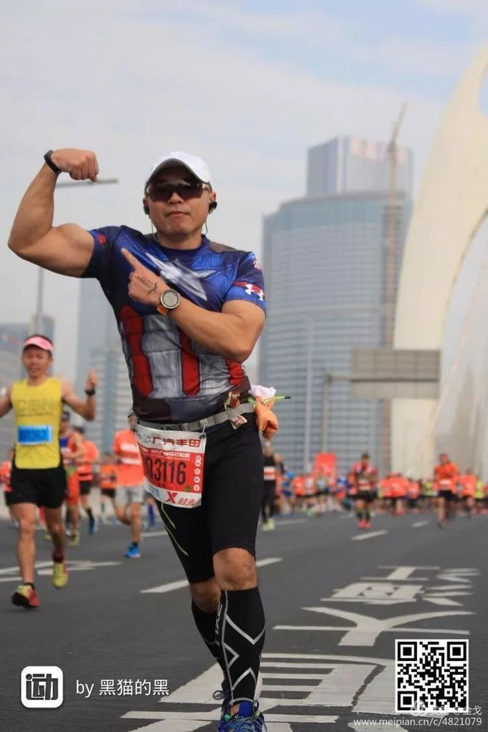 3万来自世界各地的跑友,激情昂扬地集结在起跑点,枪声响起之后奋力向前冲……先锋勇士们一马当先,风驰电掣般的冲了出去,这次我的造型是美国队长,一路上无数啦啦队叫喊着"美国队长加油",很多官方摄影师把镜头对着我说"美国队长看过来",这衣服的确博得很多眼球,跑在猎德桥上对面就是广州塔遥遥相望,很震撼。广州的天很蓝,街道也很干净,这个城市给人感觉很亲切,很干净,很春天味道。两边有合适各样的拉拉队,还有私补层出不穷,很温暖。路过广州一所高中,路边齐刷刷站着很多小妹妹穿着拉拉队服给我们加油,跑过去和带队老师说了句"你们辛苦了",并和拉拉队员们一一击掌。