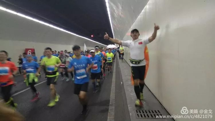 庄严国歌后就发枪起跑了,我迅速从人群中穿插游走,尽快能摆脱人潮,我们跑团的周佳犹如一头矫健的羚羊,穿梭游走在人群中,技术堪称一流,没一会我就跟不上她了,你走吧,你是精英选手我是业余选手 我慢慢来。一路背着团旗的我格外引人注目,一路很多跑友和我打招呼,但是都是那句话"金老师,跑那么快啊,加油"!我在想你们是不是都专业培训过的,哈哈!一路踩着破5的配速在18公里处追上跑马教父陈大旺,可爱的大旺啊,顶着350兔子装备和气球摇晃摇晃,边上还有两个美女陪跑,摸了旺兔的长耳朵,继续最后的几公里,可恶的350兔子尽然叫我和他们聊聊天,你们聊吧,我要追赶我的梦想,虽然我自己还没睡醒,但我知道我半马要PB ,最后一公里举着团旗冲过终点,时间定格在145。