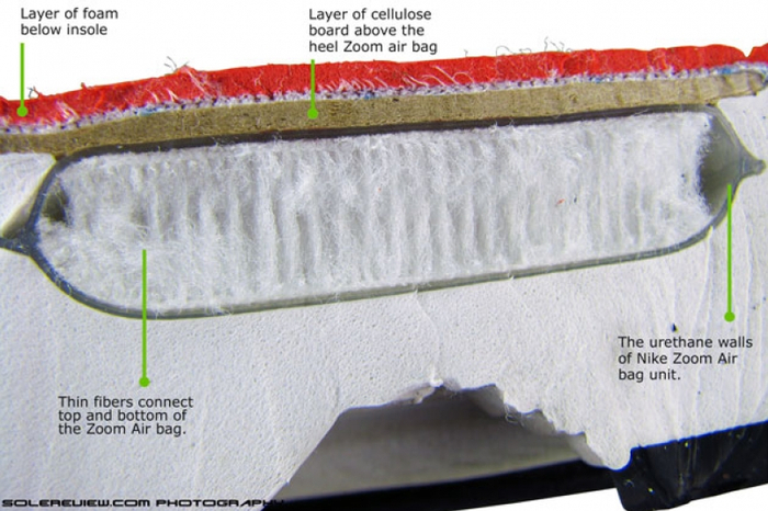 Pegasus 34 的脚跟部分的橫切面,连结气囊上下的 Tensile fibers,是令 Zoom Air 比元祖设计的气囊有更佳反应的原因。