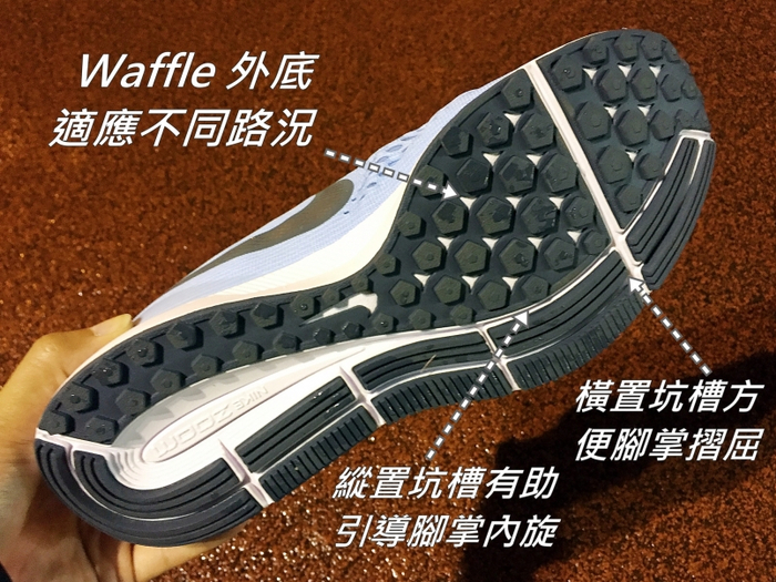 最令人感受到 Air Zoom 的反应,是在运动场跑 Tempo Run(节奏跑),这是一双很适合日常中高速以至慢跑训练的跑鞋。Air Zoom Pegasus 34 的花纹外底,抓地能力出色,也令跑者可以穿它走过平缓的泥路,难怪不少精英跑手以它作为日常训练用鞋。
