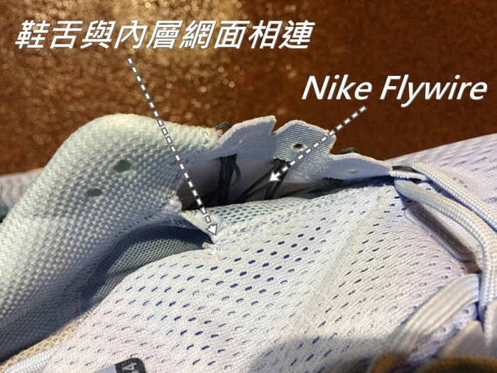 鞋身用上双层网面 Flymesh,脚趾部分的网眼大,很透气,一点也不局促。如果同时穿着薄袜,脚趾有机会感受到空气流动。鞋栊内是无缝设计,不会发生因车线刮脚的问题。因为鞋舌是与内层网面连成一体,细小沙石不易从鞋面正面走进鞋栊內。鞋身上的商标及鞋跟横线花纹用上反光设计,令晚上街跑更加安全。