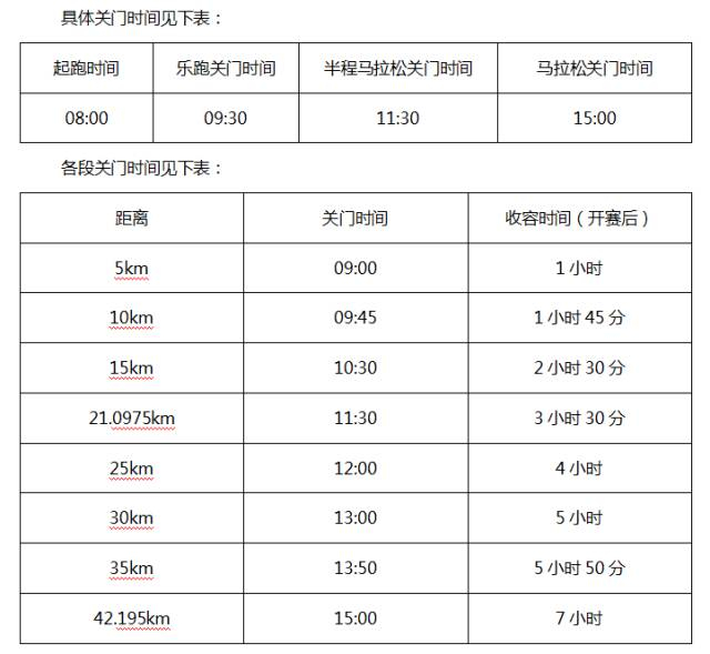 为了保证参赛选手比赛安全,限时对社会交通进行滚动封闭。比赛路线各段专设了赛时关门时间,关门时间之后,相应公里点的计时毯停止工作,相应路段将恢复社会交通。在规定关门时间内,未跑完对应距离的参赛选手须立即停止比赛,退出赛道,以免发生危险。退出比赛的选手可到沿途收容站搭乘收容车抵达终点取衣区,关门时间按自然时间计算。