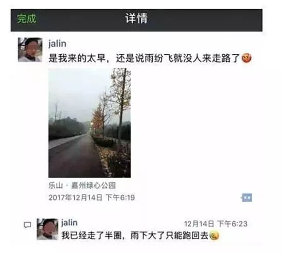 当日 18 时 19 分,王杰欣曾在朋友圈发布了一张嘉州绿心公园的照片,并称「是我来得太早,还是说雨纷飞就没人来走路了」。4 分钟后,其评论留言「我已经走了半圈,雨下大了只能跑回去」。