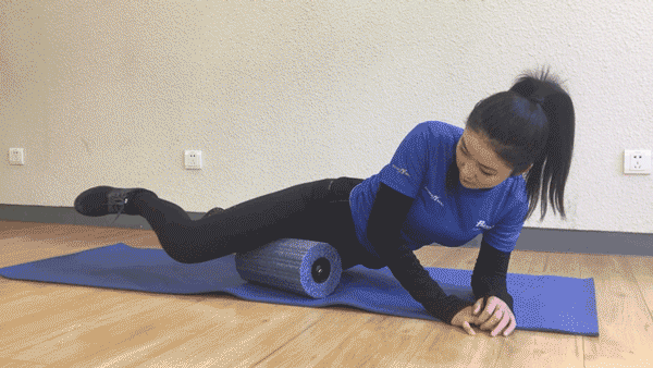(2)支撑侧肩关节以及对侧腿用力带动身体上下移动,使泡沫轴在膝关节和髋关节的范围来回滚动