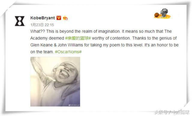 北京时间1月23日,科比在国内社交网更新了内容,翻译过来大致是:“超乎想象!《亲爱的篮球》能配得上奥斯卡金像奖的争夺,这真的意义重大!感谢......这是一项属于团队的荣誉。”