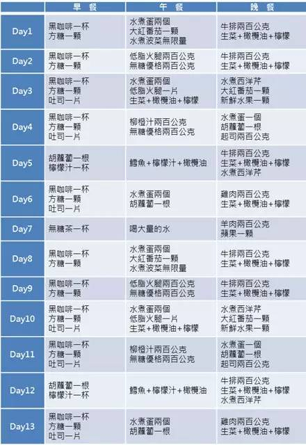 哥本哈根减肥法是一份13天的食谱,减肥者要求在13天内要求严格执行这套饮食计划。结束后可减去10~13斤。