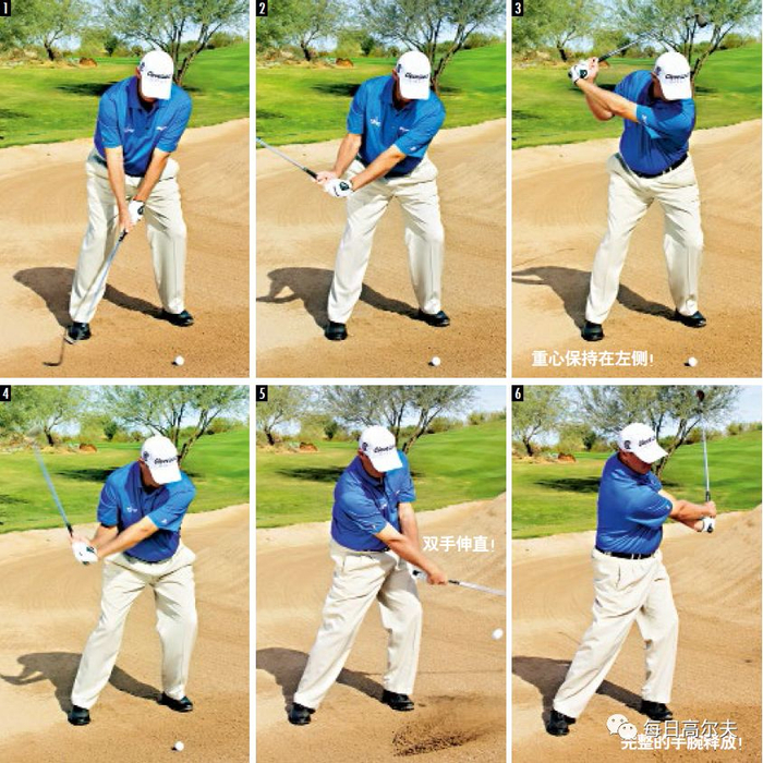 首先,在常规击球中,身体重心自然地从身体中心转移至身体右侧,在收杆时再转移至身体左侧。然而在沙坑击球中,几乎没有重心转移,你的身体重心应该在预备姿势时保持在身体左侧。挥杆过程中保持在身体左侧,收杆时,还是在身体左侧!