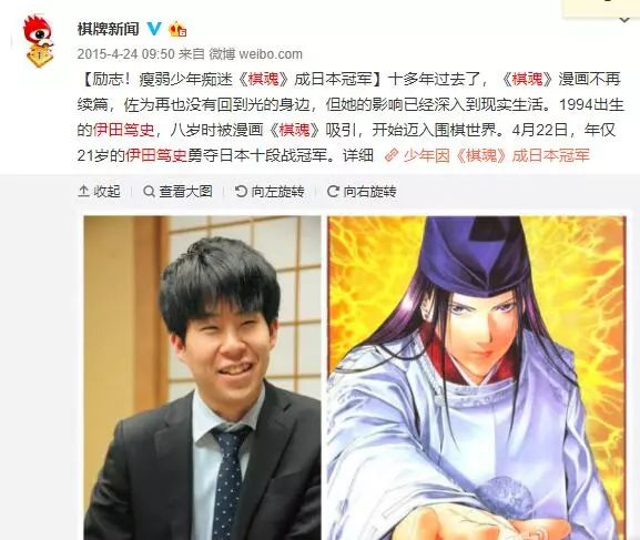 伊田笃史因为《棋魂》爱上围棋,并成为最年轻冠军的故事,也一度成为传奇。这篇新闻在微博上转发超过了2000。