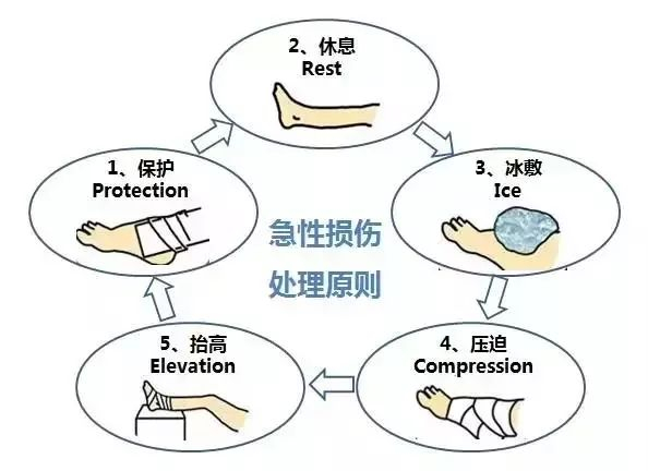 Compression(加压包扎):用弹力绷带适度加压包裹受伤部位,即可减少渗出和肿胀。