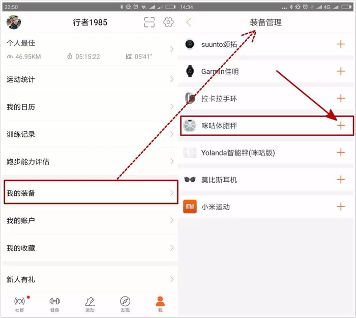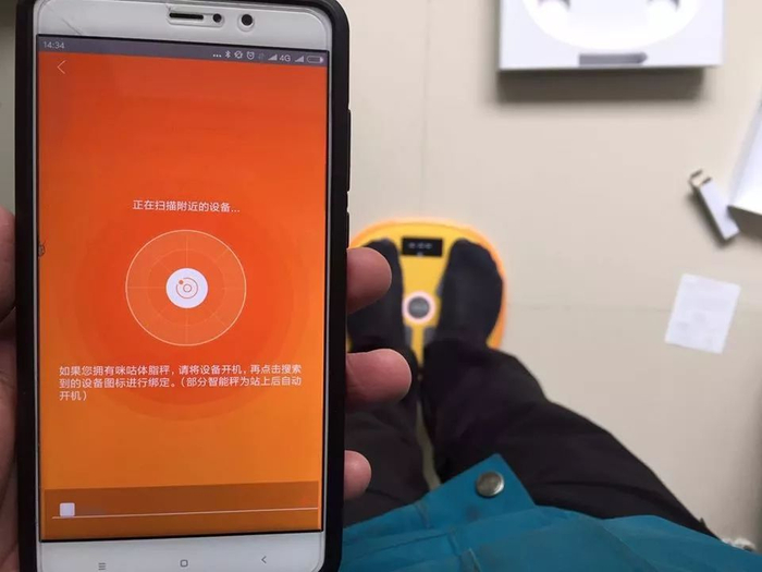 点击后面的“+”号即可开始扫描周围的装备开始绑定。这个时候要注意激活体脂秤,最简单的做法就是人站在上面。