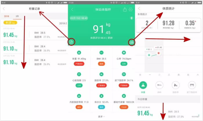 体脂秤的主操作界面,除了会显示最近的一次称重记录,还有两个小按钮可分别进入历史称重记录和体质统计,可以以列表或者变化曲线的形式来显示最近的数据变化。