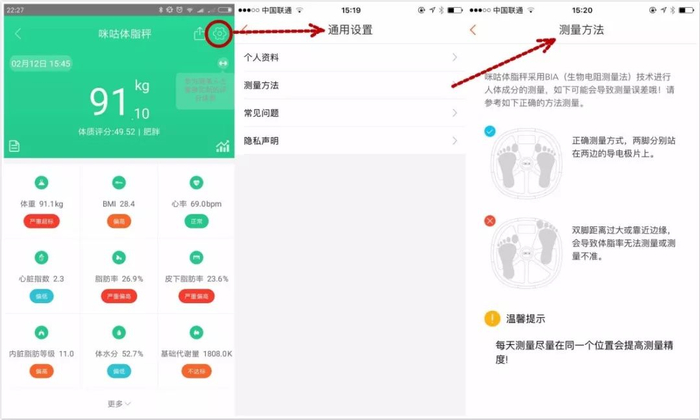 此外,使用者还可以通过通用设置对个人资料进行调整,查看测量方法和常见问题。