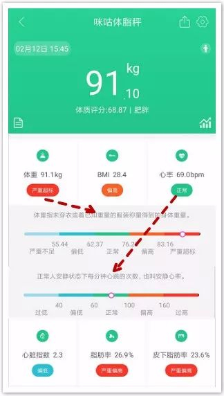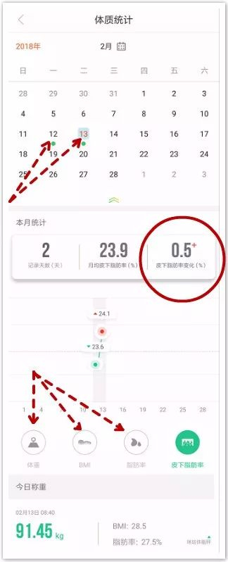 在体质统计页面可以看到各项身体数据(包括体重、BMI、脂肪率、皮下脂肪率、骨骼肌率、心脏指数等)的每次统计结果以及变化趋势。
