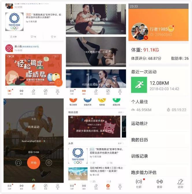 运动:跑步类的训练计划、运动主界面、线路以及历史运动轨迹等等,都集成在这个页面;