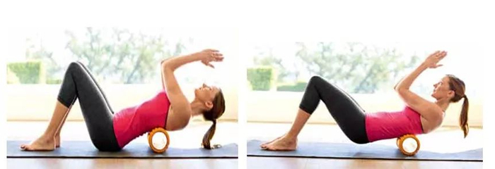 臀部往上抬离地面,让泡沫轴在背部的顶端与中段之间来回滚动20次。