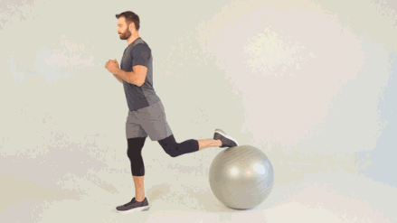 双脚分开站立在健身球前方,双手握在胸前,将左脚向后伸放在健身球上,右腿支撑身体,然后慢慢下蹲,到大腿和地面平行后,慢慢站立,然后换脚,依次重复。