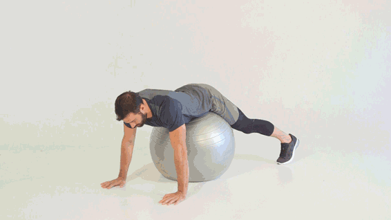 俯卧在稳定的健身球球面上,让骨盆贴紧球部中间,双手轻轻地放在地板上,双腿伸直,两脚分开,双腿处于“V”位置。保持背部平直,尽可能抬高腿部,慢慢降低并依次重复。