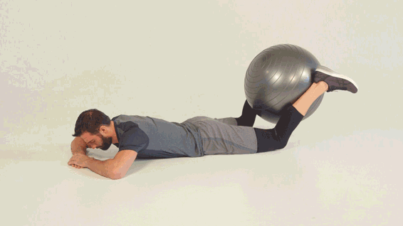 俯卧,双手弯曲,折叠在额头前方,肘部向外伸展,两只腿之间加一只健身球,放在小腿部位,保持小腿弯曲90度,然后尽力向上用腿部力量将球直线举起,慢慢落下,依次重复。