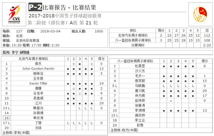 八一队接应唐川航拿下了全场最高的29分,仲为君得到17分,袁党毅得到15分,内援副攻李渊博得到13分其中9分来自拦网。北京队江川也拿到全场最高的29分,凯文·蒂略得到19分,佩林得到13分。