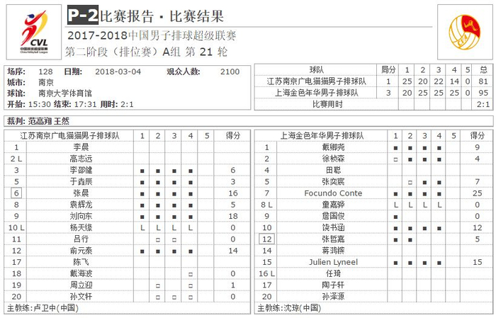 上海队的阿根廷主攻孔蒂得到全场最高的25分,法国主攻林内尔得到15分,内援饶书涵得到12分。江苏队的三叉戟刘向东、张晨和俞元泰分别贡献了18分、16分和14分。