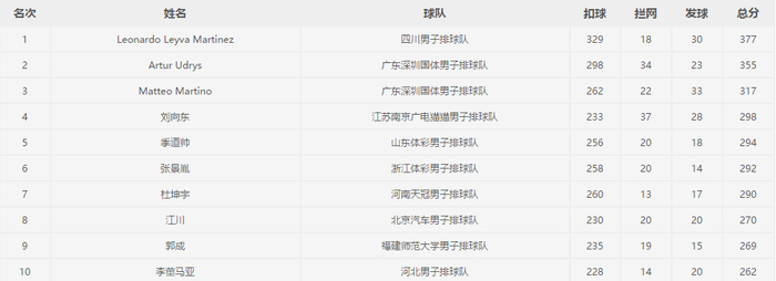 外援莱昂纳多和副攻彭世坤均得到全场最高的12分,杜海翔得到11分。山东队只有副攻郭磊一人得到10分,其他无人得分上双。