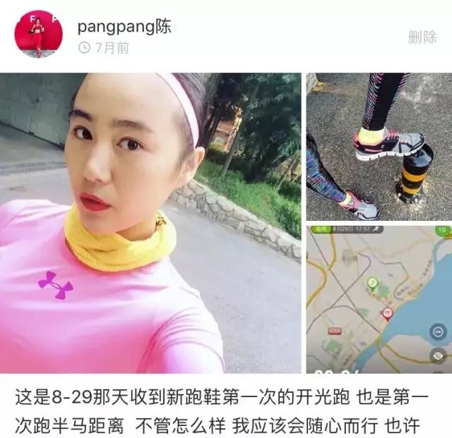 最开始跑步时,陈昭寰甚至都没给自己买一套专门的跑服和运动裤,“就穿着老公的跑步衫和短裤去跑,”当时她的想法很简单,“反正自己那么胖,买再好看的跑服,穿在身上也不好看了。”