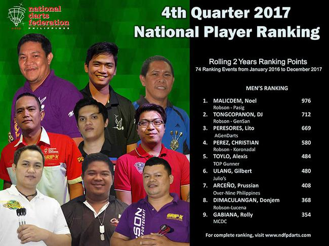 Noel Malicdem 自2017年第二季度以来一直是菲律宾排名第一的选手。Malicdem连续2年获得年度最佳克里斯体育达人,他在2017年第四季度全国排名中比第二名球员DJ Toncopanon领先高达264分。
