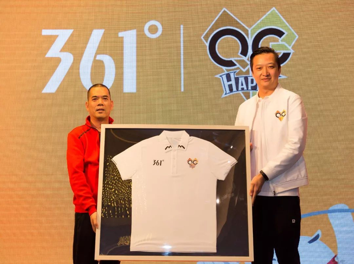 ▼361°集团执行董事兼总裁丁伍号先生与QG俱乐部创始人朱博先生展示361°与QG联名运动服装