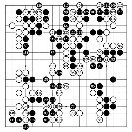 弈至154,黑大龙被擒,遂认负,本局为白的完胜名局。