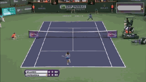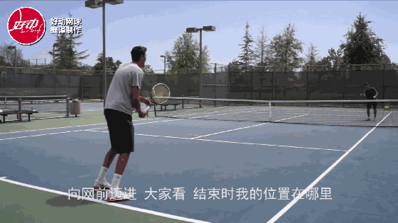 再换一个角度观察采用单脚跳步完成前场击球的整个过程——向前迈进的过程非常流畅,一记前场球完成后连接一记截击,已经占据了场上的主动。