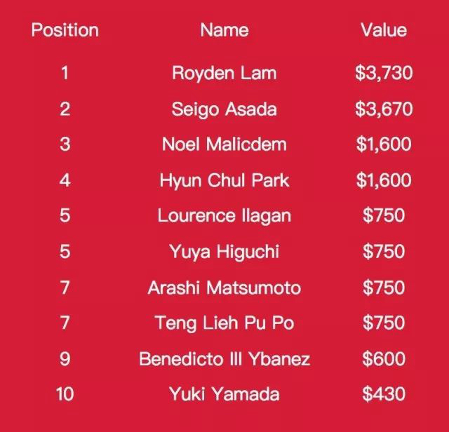 每站32强以上选手均可获相应奖金,单站冠军奖金高达$3,600,全年总奖金高达$120,000。