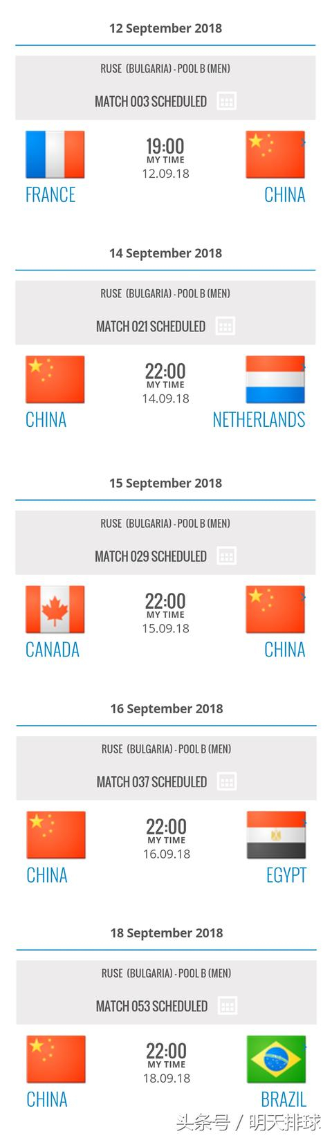 中国队今年最重要的赛事是9月9-30日在意大利和保加利亚举行的男排世锦赛,所在B组的小组赛在保加利亚鲁塞(Ruse)上演,具体的赛程已出炉。